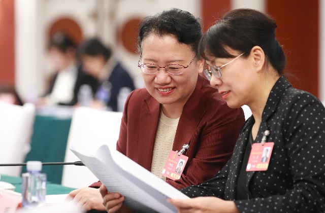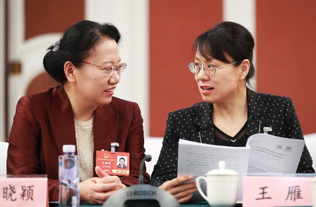 3月10日,十四屆全國(guó)人大三次會(huì)議山東代表團(tuán)小組會(huì)議,全國(guó)人大代表、棗莊市第三中學(xué)教師孫曉穎(左)與全國(guó)人大代表、煙臺(tái)市樹德技工學(xué)校副校長(zhǎng)王雁交流討論。