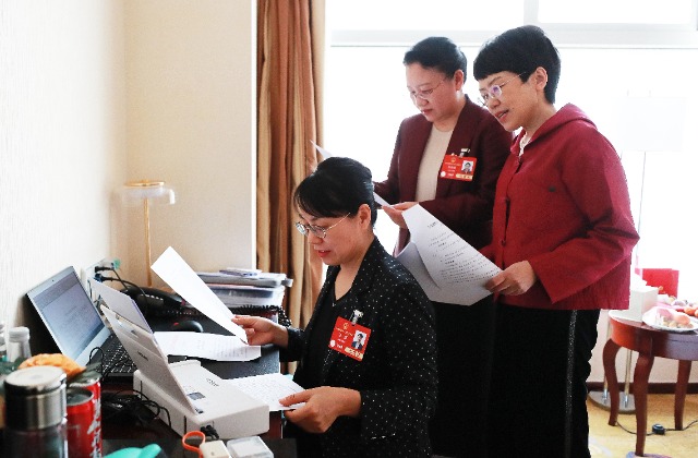 為方便工作,全國(guó)人大代表、煙臺(tái)市樹德技工學(xué)校副校長(zhǎng)王雁(左)把家里的打印機(jī)帶到會(huì)上,這是她在幫代表打印材料。