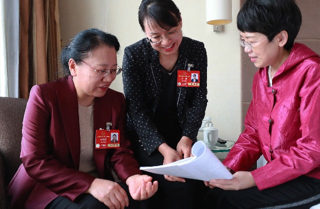 3月10日,十四屆全國(guó)人大三次會(huì)議山東代表團(tuán)小組會(huì)議結(jié)束后,孫曉穎(左)、王雁(中)和張淑琴3位全國(guó)人大代表聚在一起交流討論。
