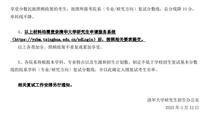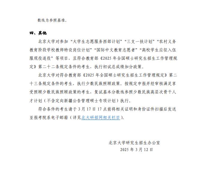 符合教育部規(guī)定并在網(wǎng)上報名時申請享受初試加分政策的考生可于3月14日前登錄我校采集系統(tǒng)(https://yz2025.bnu.edu.cn/www/ss/csjf/login)提交相關(guān)證明材料,未按規(guī)定提交材料的,不享受相應加分政策。我校根據(jù)教育部最新文件及名單審核考生資格,符合資格的考生將享受初試成績總分加分(單科不加分)。