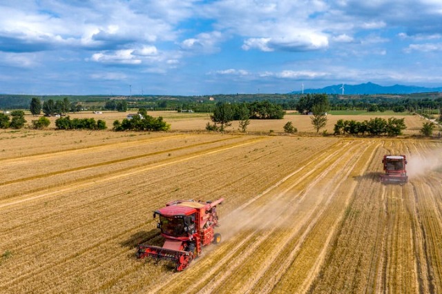 2024年6月5日,收割機(jī)在河南三門峽靈寶市的麥田里收獲小麥。新華社發(fā)(杜杰 攝)