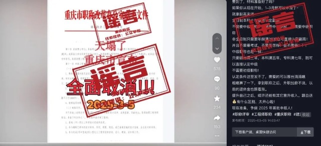 近日,某網(wǎng)民在互聯(lián)網(wǎng)平臺(tái)發(fā)布消息稱“重慶市宣布,申請(qǐng)?jiān)u審的要求取消了很多條條框框,職稱申請(qǐng)不看前置職稱,全日制本科十年直接認(rèn)定副高,不需要中級(jí)職稱!”,引發(fā)關(guān)注。經(jīng)核實(shí),網(wǎng)傳信息系謠言。