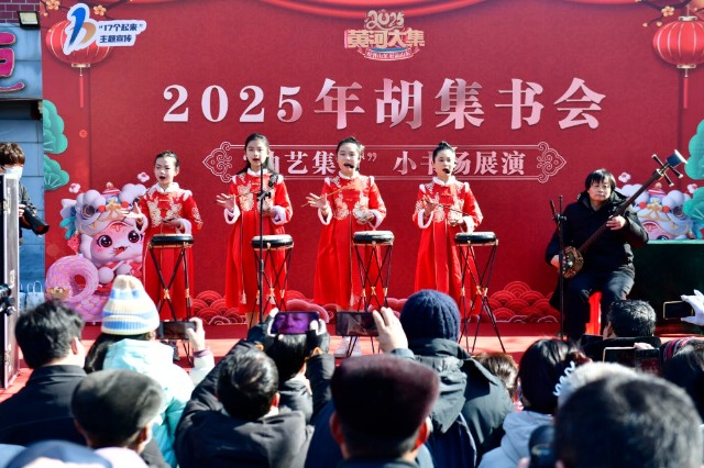 2025年2月9日,山東省惠民縣胡集鎮(zhèn)中心小學(xué)的學(xué)生在胡集書會上表演西河大鼓《勤儉節(jié)約》。新華社記者 郭緒雷 攝