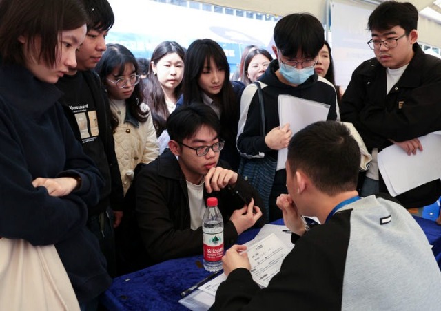 2025年2月18日,求職者在深圳市南山區(qū)招聘活動現(xiàn)場與一家企業(yè)負(fù)責(zé)人交流。新華社記者 毛思倩 攝