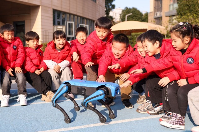 2025年1月2日,浙江省寧波市江北區(qū)甬港幼兒園的孩子們在科普活動現(xiàn)場與機(jī)器人互動。新華社記者 江漢 攝