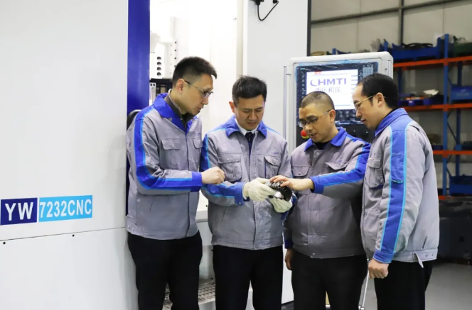 王時(shí)龍(左二)及團(tuán)隊(duì)討論齒輪加工情況。