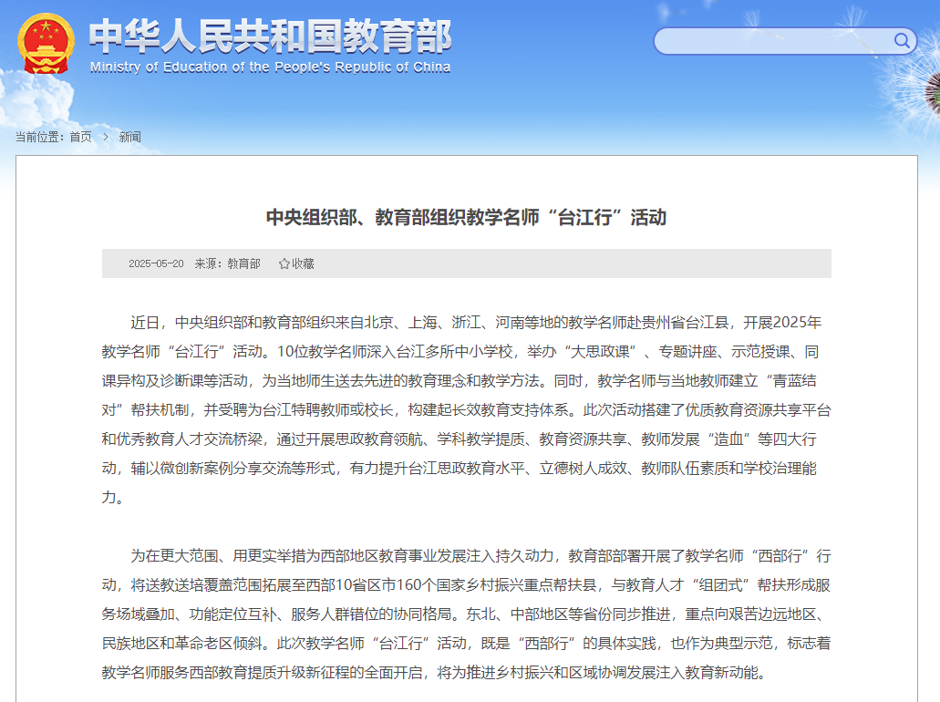 近日,中央組織部和教育部組織來自北京、上海、浙江、河南等地的教學名師赴貴州省臺江縣,開展2025年教學名師“臺江行”活動。10位教學名師深入臺江多所中小學校,舉辦“大思政課”、專題講座、示范授課、同課異構及診斷課等活動,為當地師生送去先進的教育理念和教學方法。同時,教學名師與當地教師建立“青藍結對”幫扶機制,并受聘為臺江特聘教師或校長,構建起長效教育支持體系。此次活動搭建了優(yōu)質教育資源共享平臺和優(yōu)秀教育人才交流橋梁,通過開展思政教育領航、學科教學提質、教育資源共享、教師發(fā)展“造血”等四大行動,輔以微創(chuàng)新案例分享交流等形式,有力提升臺江思政教育水平、立德樹人成效、教師隊伍素質和學校治理能力。