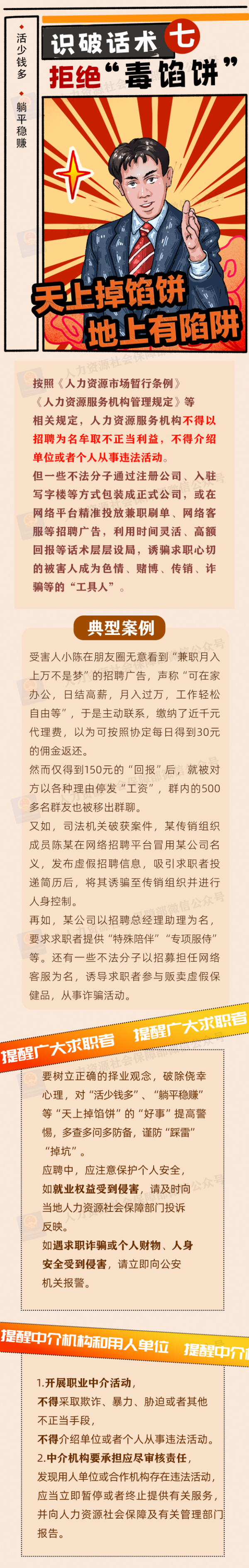 為加強(qiáng)風(fēng)險(xiǎn)防范,人力資源社會保障部、中央網(wǎng)信辦、教育部聯(lián)合發(fā)布招聘欺詐典型案例,揭示不法分子的慣用手法和話術(shù)套路,幫助高校畢業(yè)生等廣大求職者提高風(fēng)險(xiǎn)識別意識,增強(qiáng)自我保護(hù)能力。