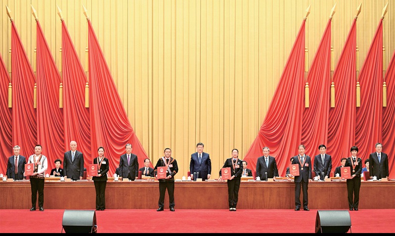 2024年9月27日,全國(guó)民族團(tuán)結(jié)進(jìn)步表彰大會(huì)在北京舉行。這是習(xí)近平等為受表彰的模范個(gè)人和模范集體代表頒獎(jiǎng)。 新華社記者 李學(xué)仁/攝