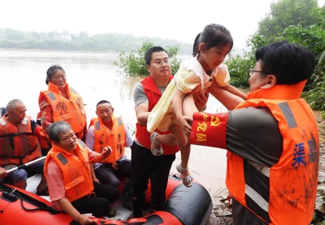 2024年7月12日,在四川省達(dá)州市渠縣李渡鎮(zhèn)燈臺社區(qū),黨員干部志愿者在洪水中轉(zhuǎn)移被困村民。新華社發(fā)(鄧良奎 攝)