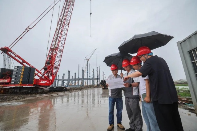 2025年6月10日,在東方特鋼鎳鉻新材智造項目建設(shè)現(xiàn)場,浙江省嘉興市南湖區(qū)駐企“紅色專班”黨員與企業(yè)施工方一起查看項目現(xiàn)場推進(jìn)情況。新華社記者 徐昱 攝