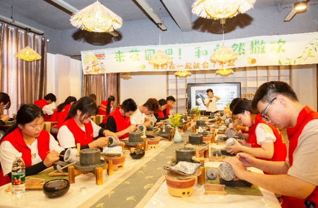 在鎮(zhèn)江市丹徒區(qū)水木年華現(xiàn)代農(nóng)業(yè)科技有限公司,學(xué)生們不僅學(xué)習(xí)了由唐代起源的茶文化故事,更在現(xiàn)場(chǎng)觀摩了從茶園管理到茶葉加工,科技賦能讓傳統(tǒng)茶產(chǎn)業(yè)煥發(fā)新生,背后所蘊(yùn)藏的現(xiàn)代農(nóng)業(yè)智慧。通過炙、碾、磨和篩四個(gè)環(huán)節(jié),學(xué)生們沉浸式體驗(yàn)了非遺抹茶的制作,這一環(huán)節(jié)讓學(xué)員們感受到古法技藝與現(xiàn)代匠心的碰撞,也認(rèn)識(shí)到現(xiàn)代農(nóng)業(yè)不僅需要技術(shù)的革新,更是文化與產(chǎn)業(yè)的有機(jī)聯(lián)結(jié)。