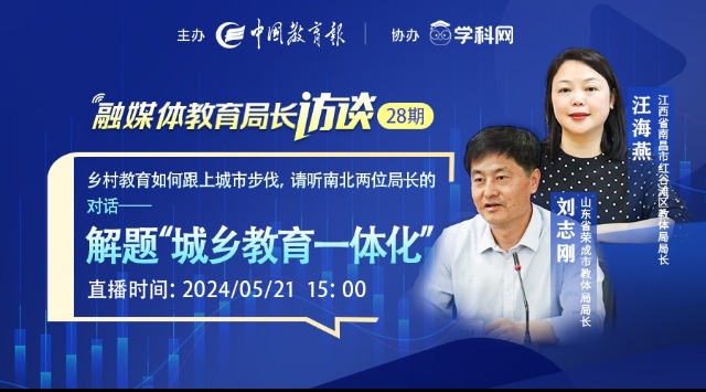 中國教育新聞網(wǎng)訊(記者 焦小新)今年的政府工作報告提出,要“加快建設(shè)高質(zhì)量教育體系,推進義務教育優(yōu)質(zhì)均衡發(fā)展和城鄉(xiāng)一體化”。具體到區(qū)域?qū)用妫绾我虻刂埔说赝苿咏逃哔|(zhì)量發(fā)展、建設(shè)教育強國、辦好人民滿意的教育?本期,《中國教育報》融媒體教育局長訪談欄目邀請到山東省榮成市教育和體育局局長劉志剛先生和江西省南昌市紅谷灘區(qū)教體局局長汪海燕女士做客直播間。兩位局長將開啟一場跨越南北的教育對話,敬請關(guān)注!