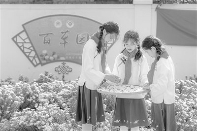近日,江蘇省高郵市秦郵小學(xué)開展了以“菊花朵朵,茶香裊裊”為主題的勞動隊課。在學(xué)校特色中草藥實踐基地“百草園”里,學(xué)生們認真采摘親手種植的菊花,清洗雜質(zhì)后放入竹篩,在勞動、體驗、觀察中增強民族自信和文化認同感。孫靜 攝 劉長軍 文