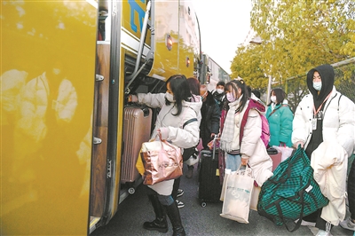 12月20日,浙江省湖州市長興職教中心和長興技師學院180余名“定向就業(yè)云貴班”的學生坐上包車大巴,踏上返鄉(xiāng)旅程?!霸瀑F班”學生主要來自貴州織金和云南昭通,長興縣距離兩地均有2000多公里,預計行程近40小時。長興縣交投汽運公司專門安排4輛大型客車,采取點對點、一站式運輸方式,最大限度避免了學生在站外聚集,降低疫情通過交通渠道輸入風險,保證學生平安回家。譚云俸 攝