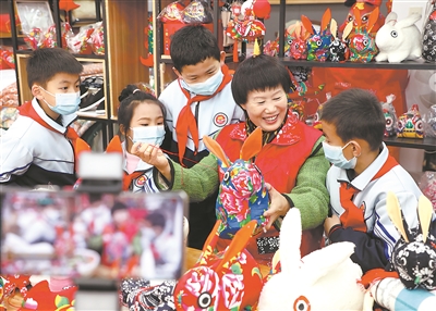 12月21日,山東省臨沂市沂南縣非遺傳承人鄭光云教小學(xué)生縫制生肖兔玩具。杜昱葆 攝