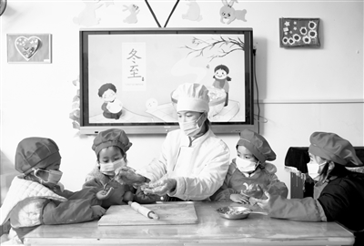 12月21日,湖南省永州市江永縣工業(yè)集中區(qū)幼兒園教師和孩子們一起包餃子。冬至來臨,當(dāng)?shù)夭糠謱W(xué)校幼兒園開展“包餃子 迎冬至”活動。田如瑞 攝