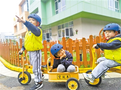 近年來,江蘇省鹽城市鹽都區(qū)實驗幼兒園大力倡導(dǎo)幼兒自主游戲、自主活動。近日,在“騎行區(qū)”自主游戲的幼兒,被路邊大樹上的一只小鳥吸引了,停車駐足,觀察討論小鳥那對白色的翅膀。張艷 攝