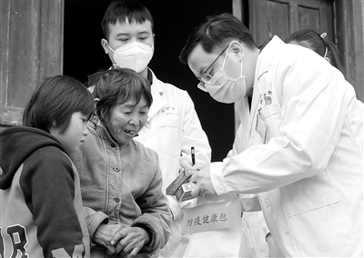 1月10日,在湖南省郴州市安仁縣渡口鄉(xiāng)長灘村,來自南華大學第一臨床學院的志愿者給當?shù)卮迕袼蜕辖】蛋?/P>