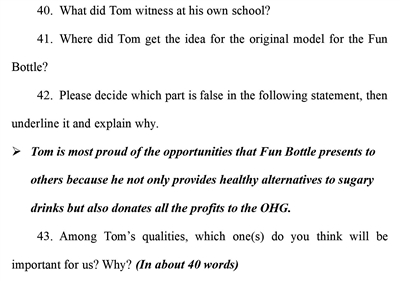 該閱讀短文是一篇記敘文,講述的是15歲的發(fā)明家和創(chuàng)業(yè)者湯姆發(fā)明了一種名為Fun Bottle的杯子,為人們提供了更加健康和便攜的果蔬飲品,并將部分售賣所得用作慈善的故事。題目要求考生閱讀這篇短文后,用英文回答問(wèn)題。不同于客觀選擇題,該題型需要學(xué)生在準(zhǔn)確理解和把握語(yǔ)篇意義的基礎(chǔ)上,形成語(yǔ)句精準(zhǔn)表達(dá),從多角度、多層面考查考生通過(guò)閱讀獲取有效信息、合理處理信息并將其轉(zhuǎn)化為書面表達(dá)的能力。