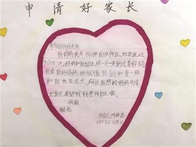 重慶市榮昌區(qū)棠香小學(xué)在假期項(xiàng)目活動中開辟了家庭共讀板塊,并開展了“誰是好家長,孩子說了算”評選活動。圖為學(xué)生開學(xué)返校后遞交的好家長評選申請書。錢頂素(重慶市棠香小學(xué))供圖