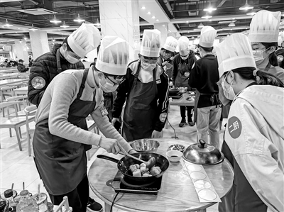 在“美食與生活”實踐操作課上,同學(xué)們系上圍裙,在大廚的指導(dǎo)下切肉、點火、煎炒、放調(diào)料……一盤色香味俱全的紅燒肉便出鍋了?!白鲲埵且环N樂趣,但它并不是一件容易的事。因此,我更加感恩平時每天為我做飯的媽媽。以后,我也會努力讓家人吃上我為他們做的美食?!币幻麑W(xué)生上完實踐操作課后說。
