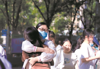 浙江省寧波市武嶺中學(xué)9名班主任身著印有“圓夢武嶺”字樣的紅衣送考,5名高三語文教師也在開考前來到考點,為考生加油鼓勁。高三(2)班的江可璐看到語文教師吳穎佳第一時間就興奮地跑上去擁抱:“吳老師能來送考,我真是太感動了!”