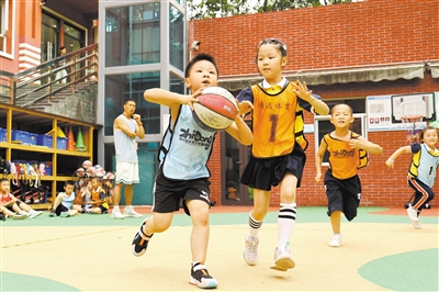 6月14日,重慶市沙坪壩區(qū)橋北幼兒園的小朋友們?cè)谏匣@球課。該園秉承“快樂(lè)運(yùn)動(dòng)”特色,開(kāi)設(shè)特色籃球、體操等課程,并組建幼兒籃球隊(duì),讓孩子們從小就體驗(yàn)運(yùn)動(dòng)的魅力和快樂(lè)。孫凱芳 攝