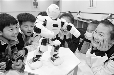 | ③安徽省阜陽市潁東區(qū)和諧路小學(xué)學(xué)生在科技興趣課堂上觀看機(jī)器人演唱歌曲和表演“功夫”。王彪 攝 |