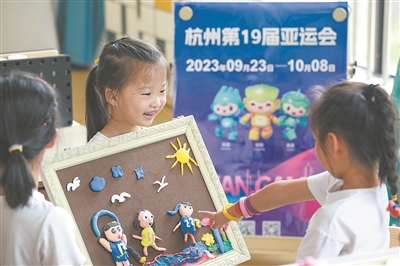 前不久,浙江省杭州市臨安區(qū)天目山鎮(zhèn)中心幼兒園聯(lián)合新時代文明實踐所開展了“童心迎亞運”主題活動。孩子們通過認識吉祥物、制作黏土畫等方式,了解杭州第19屆亞運會。圖為天目山鎮(zhèn)中心幼兒園的孩子們在展示黏土畫體育造型。通訊員 胡劍歡 攝