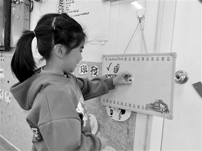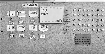 活動過程:我們把毛氈布固定在鐵皮墻上,幼兒可以自主選擇日期,用喜愛的方式表示“星期幾”,再將號碼畫在磁鐵帽上,讓其成為代表自己的個性磁鐵。磁鐵下方放置值日生安排表,若磁鐵擺放混亂,可以根據(jù)安排表調整位置,在此過程中,幼兒的比較、推理能力得到了鍛煉。“值日墻”的另一側,展示幼兒繪制的值日內容圖和工作牌。