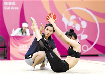 7月25日,成都大運(yùn)會(huì)中國(guó)大學(xué)生藝術(shù)體操隊(duì)集體項(xiàng)目主教練任爽(左)在成都體育學(xué)院體操館指導(dǎo)隊(duì)員訓(xùn)練。新華社記者 江宏景 攝