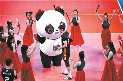 | 8月7日是中國(guó)隊(duì)球員李詠臻(中)的生日,現(xiàn)場(chǎng)工作人員及吉祥物“蓉寶”為他慶生。新華社記者 胥冰潔 攝 |