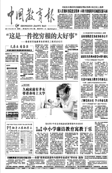 而在海南教育波瀾壯闊的發(fā)展征程中,《中國(guó)教育報(bào)》始終關(guān)注、記錄著她的每一個(gè)腳印,從2011年的《“這是一件挖窮根的大好事”——海南省實(shí)施教育扶貧移民工程采訪紀(jì)行》,到2015年的《海南試點(diǎn)城鄉(xiāng)“同步課堂”》,再到2021年的《海南省以信息化為支撐構(gòu)建特色教育體系》,每一段文字,每一張照片,每一次傳播,都為“南海明珠”的閃耀增添了教育亮色。我為我的前輩們驕傲,也為中國(guó)教育報(bào)的客觀記錄、專業(yè)報(bào)道而感動(dòng)。