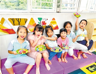 今年暑期,廣州工控幼教組織屬下18所幼兒園和1所托育中心開展暑期托管服務(wù)。此項(xiàng)服務(wù)已連續(xù)開展3年,多元趣味的課程、豐富多彩的活動(dòng),深受幼兒和家長的歡迎。圖為廣鋼科城山莊幼兒園參加暑期托管的孩子們,正在展示自己的手工作品。陳麗蕓 攝