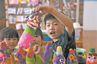 日前,浙江省諸暨市暨南街道街亭幼兒園的孩子們用各種彩泥制作成蝸牛、毛毛蟲、棒棒糖等,裝飾廢舊瓶子、扇子,培養(yǎng)了動(dòng)手能力和想象力,提升了環(huán)保意識(shí)。圖為孩子們?cè)谡故居貌誓嘌b飾的瓶子。陳霞芳 攝