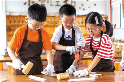 8月22日,在安徽省蕪湖市繁昌區(qū)城關(guān)幼兒園木工坊,暑托興趣班的孩子們使用各種木工工具分組開展創(chuàng)意木工活動。活動旨在培養(yǎng)孩子們形成專注、協(xié)助、自主、有序和探究的“工匠精神”。田園園 攝