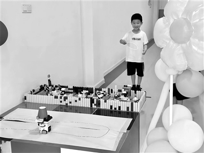我們還投放了數(shù)智化建構(gòu)材料,孵化出多種探究未來的學習方式。比如,機器人材料,幼兒可以自主設(shè)計游戲規(guī)則,探究機器人行進路線。如在設(shè)計“叢林探險”游戲時,幼兒有許多新奇的想法:需要讓機器人穿越多條路線;得有起點和終點……在創(chuàng)設(shè)路徑時,幼兒用旗幟卡作為起點,用獎杯卡作為終點,通過機器人識別系統(tǒng),成功解決了問題。