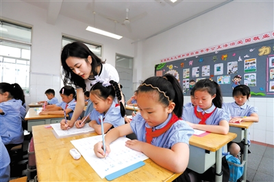 9月11日,江蘇省無錫市揚名中心小學(xué)教師指導(dǎo)學(xué)生寫漢字。當(dāng)日,該校開展推普周主題宣傳活動,以營造“講好普通話 寫好規(guī)范字”的良好氛圍,增強師生的語言文字規(guī)范意識和推廣普通話的參與意識。