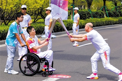 9月12日,杭州第19屆亞運會火炬在寧波傳遞,寧波職院341名志愿者為亞運“薪火”相傳保駕護航。圖為志愿者為火炬?zhèn)鬟f提供志愿服務(wù)。學(xué)校供圖