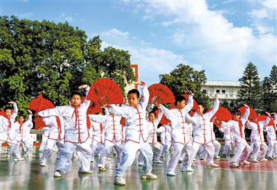 9月15日,四川省華鎣市祿市鎮(zhèn)占云小學(xué)的學(xué)生在大課間練習(xí)“太極功夫扇”。該校把武術(shù)引入校園,開設(shè)太極扇、太極拳等課程,增強(qiáng)學(xué)生體能,陶冶學(xué)生情操,鞏固“雙減”成果。邱海鷹 攝