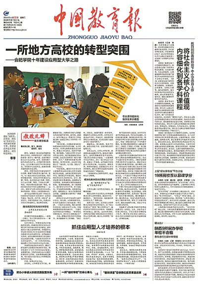 在合肥學(xué)院校史館中,至今仍然存放著一張2014年4月16日《中國教育報》的頭版報紙,當日頭版頭條《一所地方高校的轉(zhuǎn)型突圍——合肥學(xué)院十年建設(shè)應(yīng)用型大學(xué)之路》將合肥學(xué)院以“地方應(yīng)用型高校排頭兵”之名為全國教育系統(tǒng)所熟知。二十年砥礪前行,這所年輕而富有改革之力的學(xué)校從來沒有停止過在地方高校應(yīng)用型發(fā)展道路上的經(jīng)驗探索。