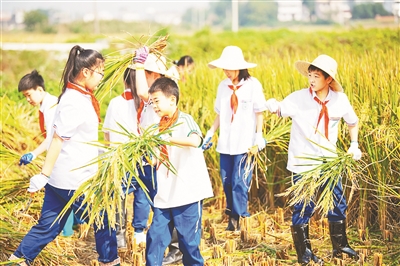 10月15日,安徽省蕪湖市繁昌區(qū)繁陽(yáng)鎮(zhèn)城關(guān)一小,教師組織學(xué)生去校外勞動(dòng)基地開(kāi)展水稻收割勞動(dòng)實(shí)踐活動(dòng)?;顒?dòng)的開(kāi)展讓同學(xué)們感受到豐收的喜悅,同時(shí)也體會(huì)到糧食的來(lái)之不易。田園園 攝