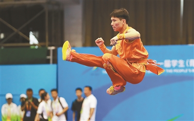 11月6日,首屆學(xué)青會武術(shù)套路(校園組)大學(xué)男子組自選南拳項目決賽舉行,這是運動員在比賽中。