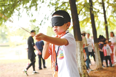 頂“蘑菇”、抖抖樂、松果傳遞……近日,湖南長沙松雅湖濕地公園變身“運動場”,來自長沙師范學(xué)院附屬第二幼兒園的1300余名幼兒、教師、家長,在這里與大自然親密“相擁”,開展戶外親子徒步活動,強健體魄、增進(jìn)感情。圖為幼兒參與“森林盲行”。