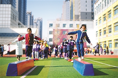 十一月十七日,河北省唐山市路北區(qū)橡樹灣小學學生利用課間時間玩平衡木。唐山市路北區(qū)鼓勵各中小學利用課間時間組織學生開展豐富多樣的文體活動,幫助孩子在體育鍛煉和趣味游戲中享受樂趣、增強體質。新華社記者 牟宇 攝