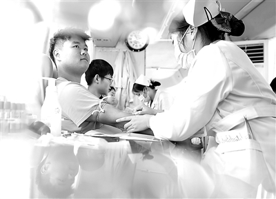 近日,南華大學(xué)衡陽醫(yī)學(xué)院大一新生在開進學(xué)校的獻血車上獻血。衡陽醫(yī)學(xué)院在2023級大學(xué)新生中開展志愿無償獻血活動,關(guān)懷社會,奉獻青春。