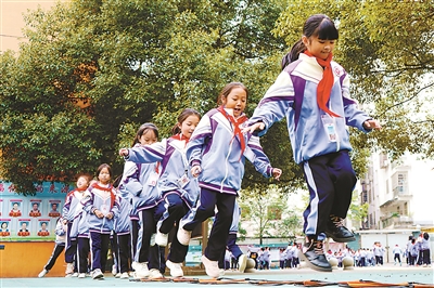 近日,江西省宜春市上高縣第四小學學生利用課間十分鐘參加跳敏捷梯活動。該校充分利用課間十分鐘,組織學生到室外參加跳繩、老鷹捉小雞等活動,增強學生體質(zhì)。陳旗海 攝