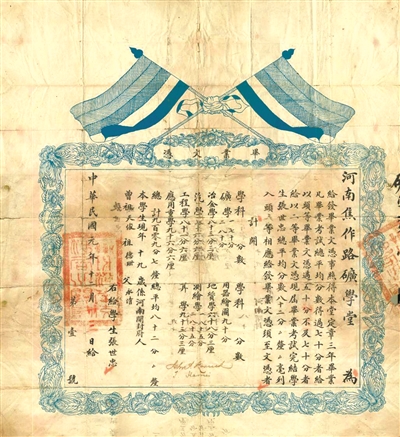 焦作路礦學(xué)堂一號畢業(yè)證,是中國礦業(yè)大學(xué)歷史上第一張畢業(yè)證書。證書的主人叫張世忠,河南開封人。該證書為長46厘米、寬42厘米的長方形,正中上方印有兩幅交叉的中華民國首面法定國旗——五色旗,代表漢、滿、蒙、回、藏五族共和,同時也代表仁、義、禮、智、信五德。最右側(cè)有騎縫章,顯示該證書應(yīng)有底聯(lián)存檔。國旗下面是防偽紋樣圍成的證心,“畢業(yè)文憑”四字橫嵌在紋樣上部,證心為繁體豎排印刷,內(nèi)容顯示當(dāng)時的學(xué)制為三年;其后清晰分列科目,計分嚴(yán)格,細(xì)為分、厘、毫,按三年總平均分?jǐn)?shù)分為頭等、二等畢業(yè)文憑,并列有曾祖、祖、父三代人姓名??颇砍煽兿路綖橛9究偟V師堪瑞克及英籍教師李恒禮先生的英文簽名,時間顯示為中華民國元年12月,并蓋有“辦理河南交涉局之關(guān)防”印章。證書顯示張世忠以八十二分成績拔得頭籌,獲得編號為第一號的畢業(yè)證書。
