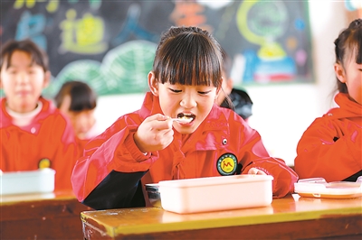 12月6日,貴州省黔西市五里布依族苗族鄉(xiāng)荒田村軍民小學(xué)三年級學(xué)生正在享用免費(fèi)營養(yǎng)午餐。近年來,當(dāng)?shù)爻掷m(xù)推進(jìn)農(nóng)村學(xué)生營養(yǎng)午餐關(guān)愛工程,確保學(xué)生吃得飽、吃得好。周訓(xùn)超 攝
